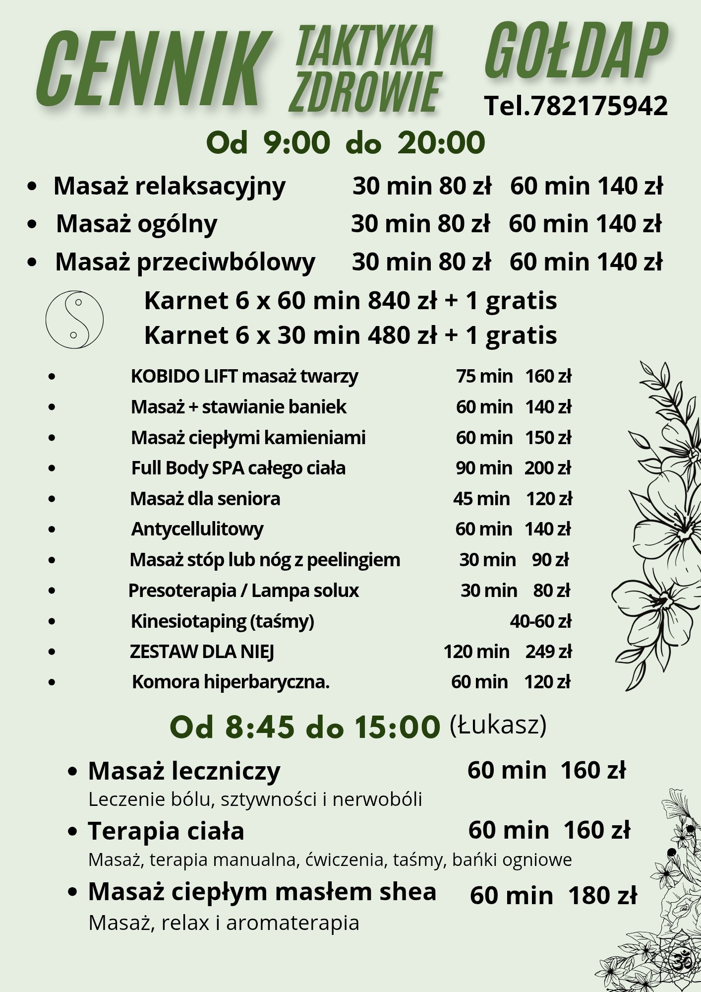 TAKTYKA ZDROWIE GOŁDAP Masaż Terapia manualna Komora hiperbaryczna Presoterapia Taśmy Kobido 28 opinii GoogleOpublikowano na Estera OłówTrustindex sprawdza, czy pierwotnym źródłem recenzji jest Google. Niejednokrotnie korzystałam z usług, masażu, stawiania baniek czy "nastawianiu" moich kości. Od relaksu do pomocy na ból znajdziesz w Taktyka zdrowie 😊 korzystam i polecam! A teraz nawet jest możliwość kupienia sobie świeczki do masażu, którą wykonuje Łukasz z naturalnych składników! Jest mega a skóra po tym aksamitna. Indywidualne podejście i ten klimat na miarę SPA. PolecamOpublikowano na Małgorzata RaszewskaTrustindex sprawdza, czy pierwotnym źródłem recenzji jest Google. Polecam z całego serca ❤️ Trafiłam do Pana Łukasza z bólem kręgosłupa. Po masażu wyszłam jak nowo narodzona. Cudowne ręce czynią cuda 😍.Opublikowano na Ewa HajdukTrustindex sprawdza, czy pierwotnym źródłem recenzji jest Google. Bardzo polecam. Pomijam wnętrze, które jest cudowne. Masaż był wyśmienity. Kładąc się, wiedziałam, że będzie bardzo dobrze. Nie myliłam się 😉Opublikowano na Kamila PlutaTrustindex sprawdza, czy pierwotnym źródłem recenzji jest Google. Polecam z całego serca! ❤️ Dostałam bon prezentowy na SPA całego ciała w TAKTYKA ZDROWIE w Gołdapi i... to był strzał w dziesiątkę! 💆🏽♀️ Zabieg był cudownie relaksujący – masaż, pielęgnacja całego ciała, atmosfera pełna spokoju. Skóra po wszystkim była gładka jak nigdy, a ja wyszłam z gabinetu totalnie zresetowana. Dziękuję Pani Justyno. :) Miejsce jest bardzo zadbane, przepięknie pachnie i ta muzyka... no BAJKA! Personel przemiły i profesjonalny, wszystko na najwyższym poziomie. Idealne na chwilę tylko dla siebie – nawet jeśli prezent był niespodzianką, na pewno tam wrócę! 😊Opublikowano na Andrzej DołęgaTrustindex sprawdza, czy pierwotnym źródłem recenzji jest Google. Świetny kontakt, bardzo miła obsługa a usługi na wysokim poziomie - polecam 👍😃Opublikowano na Karolina Omilian-NawrockaTrustindex sprawdza, czy pierwotnym źródłem recenzji jest Google. Miałam przyjemność odwiedzić ten wyjątkowy salon masażu i z czystym sumieniem mogę polecić go każdemu. Wnętrze jest przepięknie urządzone, co od razu wprowadza w relaksujący nastrój. Atmosfera jest niezwykle przyjazna i spokojna, dzięki czemu można naprawdę odpocząć od codziennego zgiełku. Pracownicy są profesjonalni, a masaż wykonany z wielką starannością i uwagą. Dodatkowo, po zabiegu można rozkoszować się pyszną herbatą, co dopełnia całe doświadczenie. Zdecydowanie wrócę tutaj.Opublikowano na Agnieszka KrukTrustindex sprawdza, czy pierwotnym źródłem recenzji jest Google. Korzystałam z masaży u pana Łukasza, który ma holistyczne podejście do organizmu człowieka. Rewelacyjne masuje i ma ogromną wiedzę. Czujesz, że oddajesz się w fachowe ręce. Atmosfera, dbałość o klienta na najwyższym poziomie. Widzisz efekty zabiegów.....bo przecież o to w tym wszystkim chodzi. Cieszę się, że mapa naszego miasta wzbogaciła się o tak profesjonalny salon masażu. PolecamOpublikowano na Ewelina UszyńskaTrustindex sprawdza, czy pierwotnym źródłem recenzji jest Google. Serdecznie polecam! Masaż bardzo intensywny, masażyści posiadają szeroką wiedzę oraz z pasją podchodzą do swojej pracy. Dodatkowo, wystrój gabinetu sprzyja relaksowi i regeneracji 😊Opublikowano na Małgorzata StępowskaTrustindex sprawdza, czy pierwotnym źródłem recenzji jest Google. Pan Łukasz, wspaniały, godny polecenia masażysta. Posiada dużą wiedzę odnośnie budowy człowieka i samego masażu. Nie odmówi pomocy nikomu!!! Oceniam jego zdolności i zaangażowanie na 6+. PozdrawiamOpublikowano na Magdalena KulikowskaTrustindex sprawdza, czy pierwotnym źródłem recenzji jest Google. Pełen profesjonalizm.Serdeczny człowiek,miła atmosfera... Polecam.